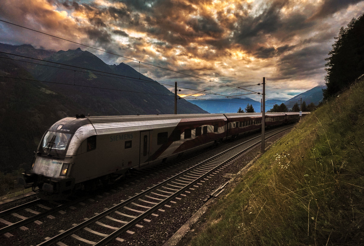 Die "Flagge" fährt als railjet 698 (Flughafen Wien (VIE) - Salzburg Hbf - Klagenfurt Hbf), bei Oberfalkenstein, die Tauernbahn-Südrampe hinunter.
