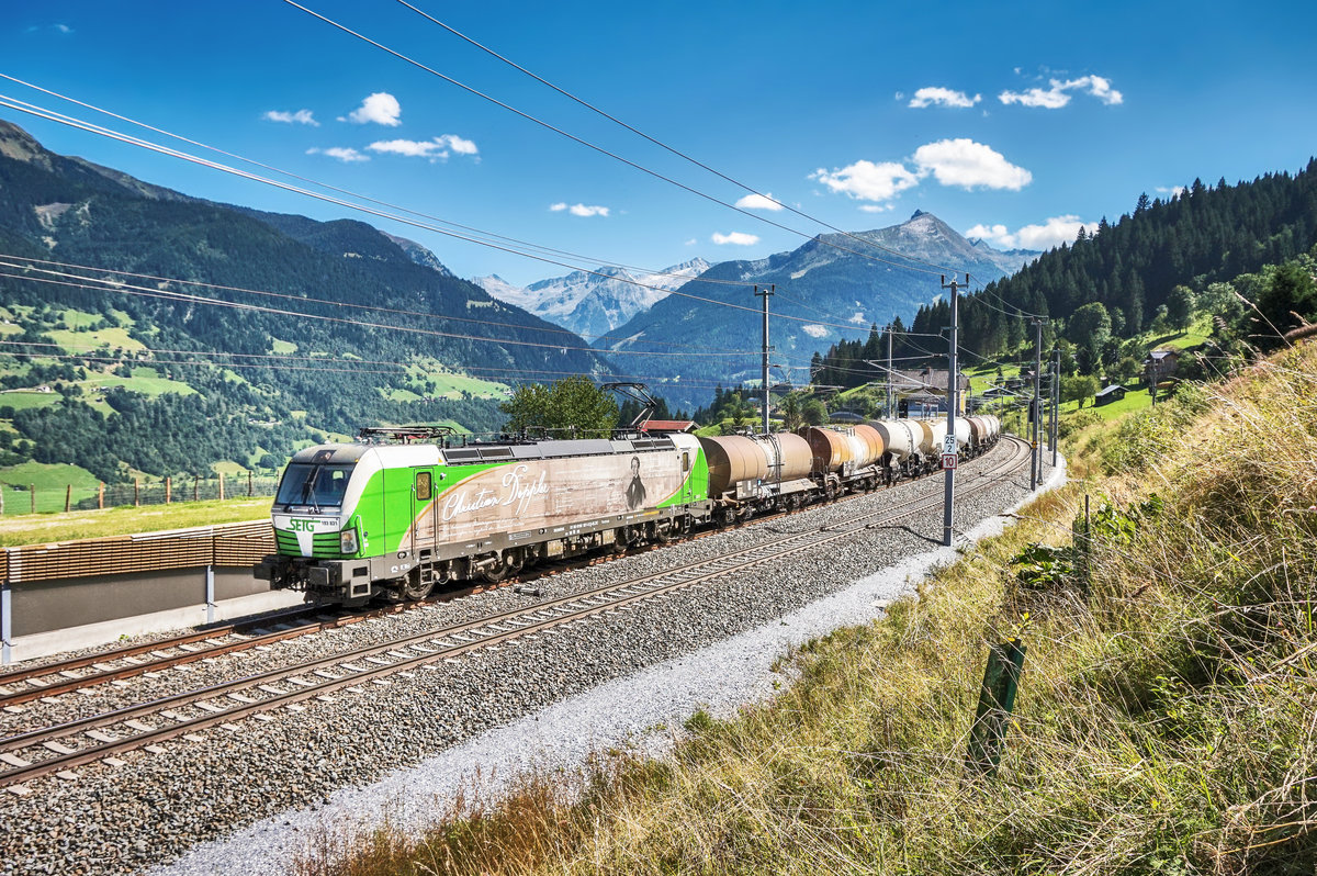 Die für "Christian Doppler" werbende ELL 193 831-5 der SETG, durchfährt mit dem ersten Teil des Kreidezugs aus Slowenien, den ehemaligen Bahnhof Angertal.
