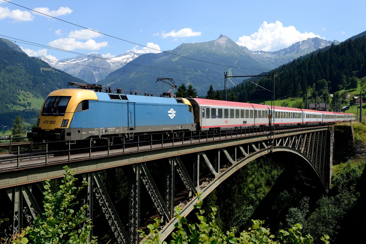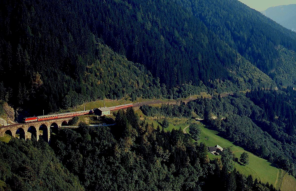 Kurz vor Mallnitz überquert eine 1044 mit einem Schnellzug im September 1998 den Waldmanngraben-Viadukt. Heute geht es schneller, aber langweiliger durch den Kaponig-Tunnel.