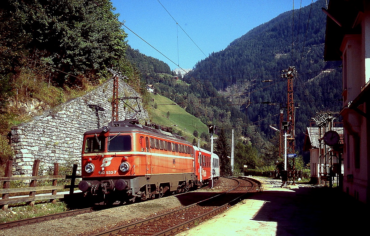 Mit einem Regionalzug verlässt die 1142 533-7 im September 1998 den Bahnhof Kaponig. Früher hieß der Bahnhof Obervellach, mit dem gleichnamigen, einige húndert Meter tiefer liegenden Ort verband ihn eine Seilbahn. Heute liegen hier keine Gleise mehr.
