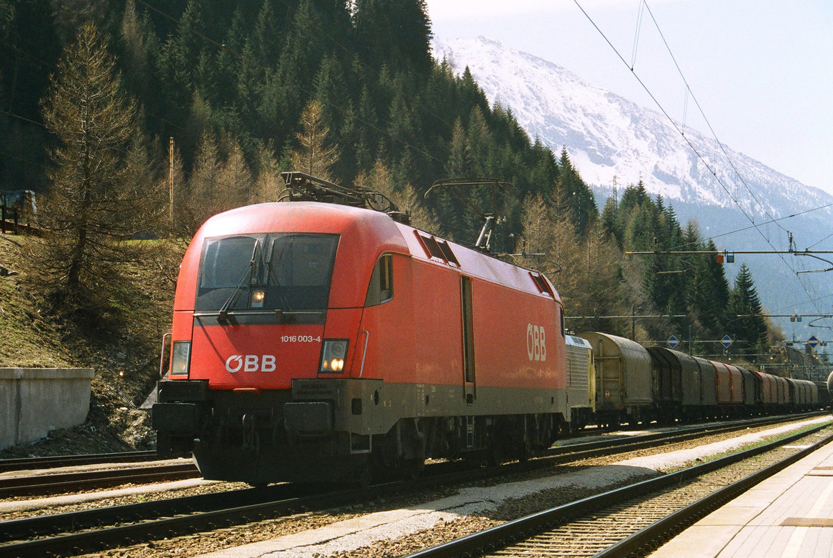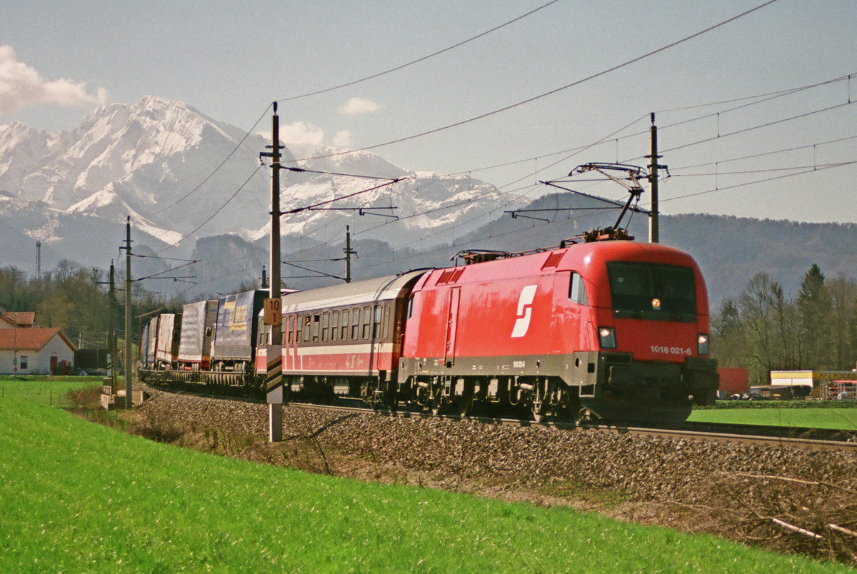 01. April 2001 bei Salzburg-Elsbethen: Der Taurus 1016 021 hat die Tauern hinter sich gelassen und wird mit der "Rollenden Landstraße" in Kürze Salzburg erreichen. Jürgen Krause