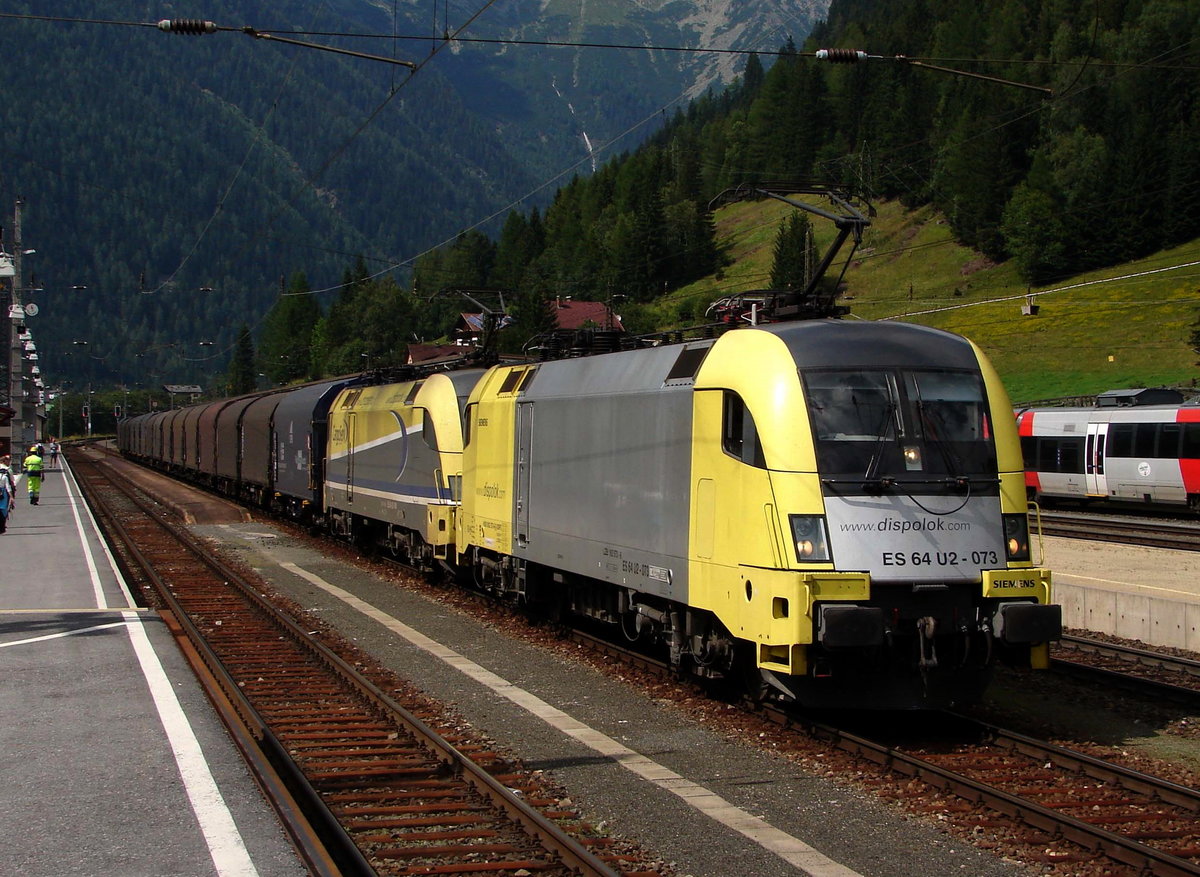 ES64 U2 073 und 040 (es war dann bei EVU CargoServ, heute ist als ES 64 U2 072 gehört) mit einem Güterzug von Linz in Richtung Villach bei der Durchfahrt in Mallnitz-Obervellach.