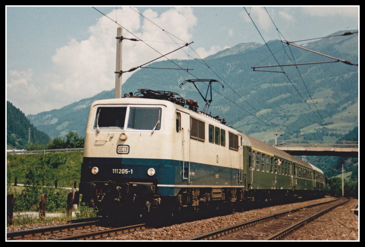 Lange Zeit kamen Loks der Reihe 111 planmäßig über die Tauernbahn bis nach Kärnten. Hier zu sehen 111 205 mit einem Schnellzug bei Dorfgastein am 26.06.1989 Herbert Pfoser