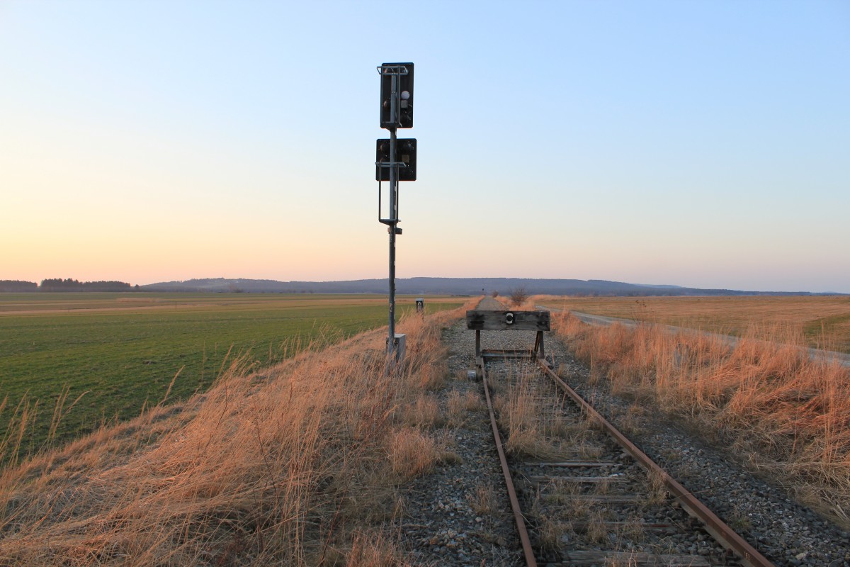 Man könnte meinen Vergangenheit und Gegenwart treffen hier aufeinander bei Strecken- Km 1,00 an der ehemaligen Lokalbahn Göpfritz-Raabs an der Thaya, bis hierher wurde der Oberbau der Lokalbahn entfernt und dieses kurze Stück erinnert an die einstige Lokalbahn, März 2014
