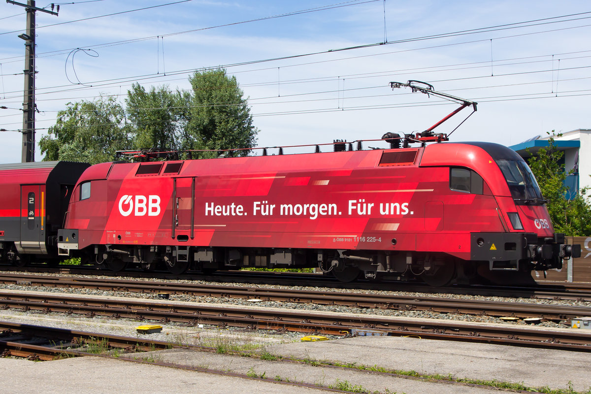 1116 225-4, mit Werbeschriftzug versehen, schiebt den RJX aus Dornbirn gen Feldirch am 26.5.20.