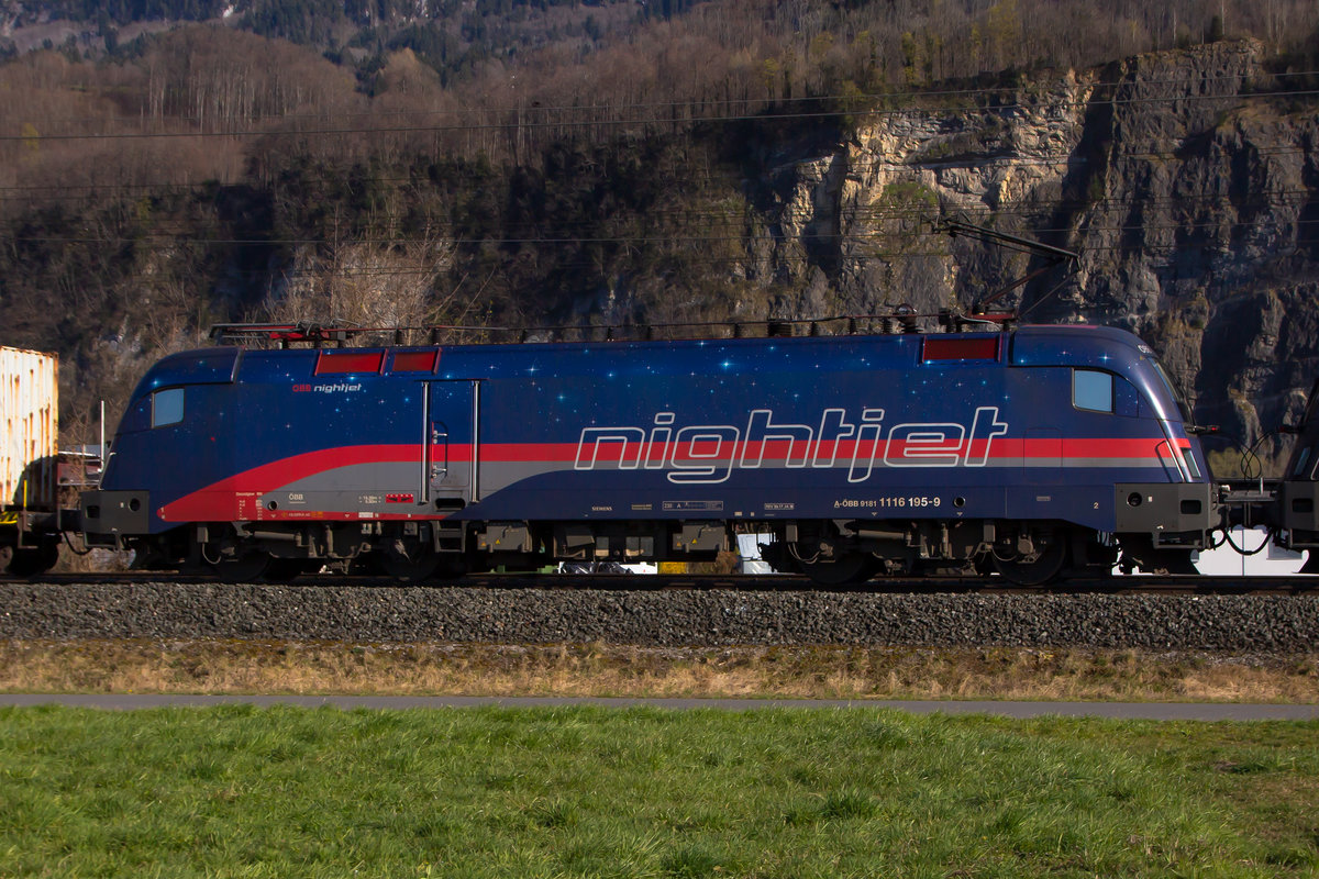 Im letzten Licht des Tages zieht die "Sternenlok" ihren Güterzug aus Wolfurt nach Dornbirn.1116 158-7, 3.4.20