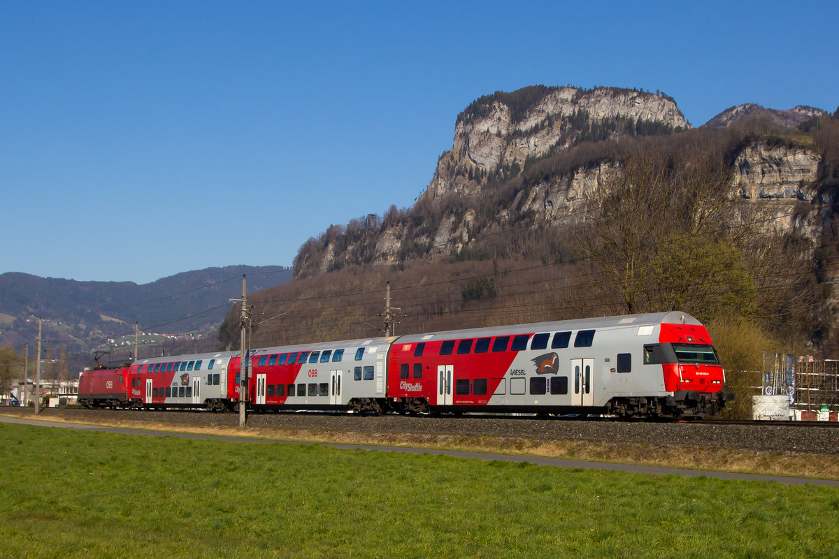 Aufgrund der aktuellen Lage verkehren die Dosto Züge in Voralberg derzeit nur mit 3 Wagen statt mit 4 respektive 5. 1116-100-9 schiebt die S-Bahn gen Hohenems. 23.3.20