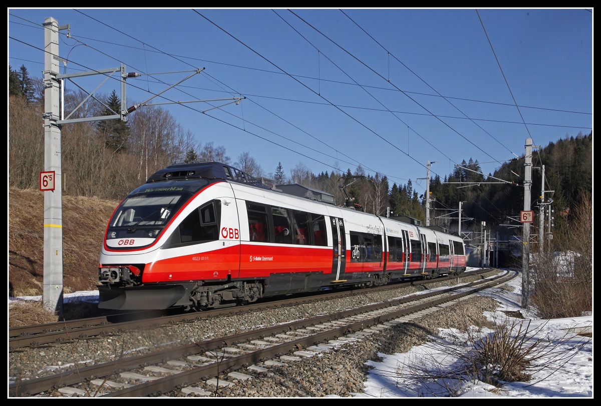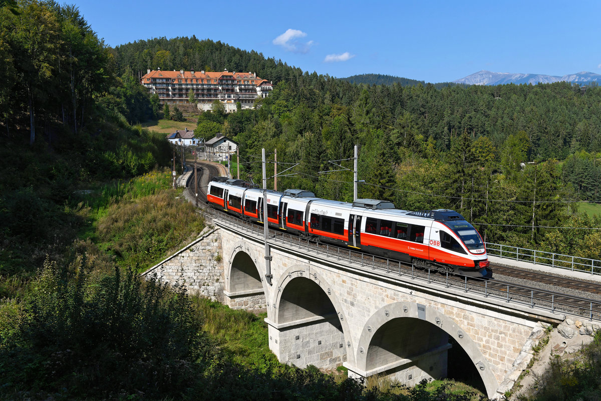 Die Semmeringbahn hatte für den Nahverkehr zwischen Payerbach-Reichenau und Mürzzuschlag ein exklusives Triebfahrzeug vorzuweisen. Der 4023.011 war das einzige Fahrzeug dieser Baureihe in Ostösterreich und primär auf der spektakulären Gebirgsstrecke im Einsatz. Genutzt werden die Fahrten hauptsächlich von Wandereren. Den bereits in neuen Farben erstrahlenden Talent-Triebwagen konnte ich am 21. September 2020 beim Verlassen des Haltepunkts Wolfsbergkogel mit dem Kurhotel Semmering und der Rax im Hintergrund fotografieren. Inzwischen wurde der Triebzug allerdings nach Salzburg umstationiert und die Baureihe 4024 hat die Dienst übernommen. Hintergrund ist, dass nun Fahrkartenautomaten an allen Haltestellen der Semmeringbahn aufgestellt wurden - beim 4023.011 konnte man im Fahrzeug die Fahrscheine lösen. Daher kann nun auf diese Sonderlösung verzichtet werden und der Fahrzeugeinsatz ist freizügiger. Christoph Schneider