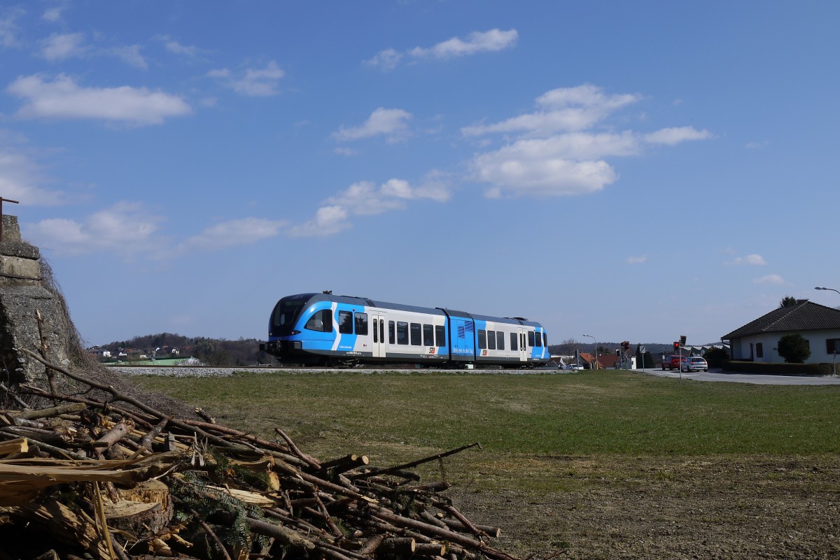 Am 19.03. 2013 erwischte ich den für die steirische S-Bahn werbenden GTW 5062 003 der STLB als R8682 auf dem Weg von Graz nach Gleisdorf, in Thomsche kurz vor dem 531 Meter langen Laßnitz-Tunnel. Kriwetz Lukas