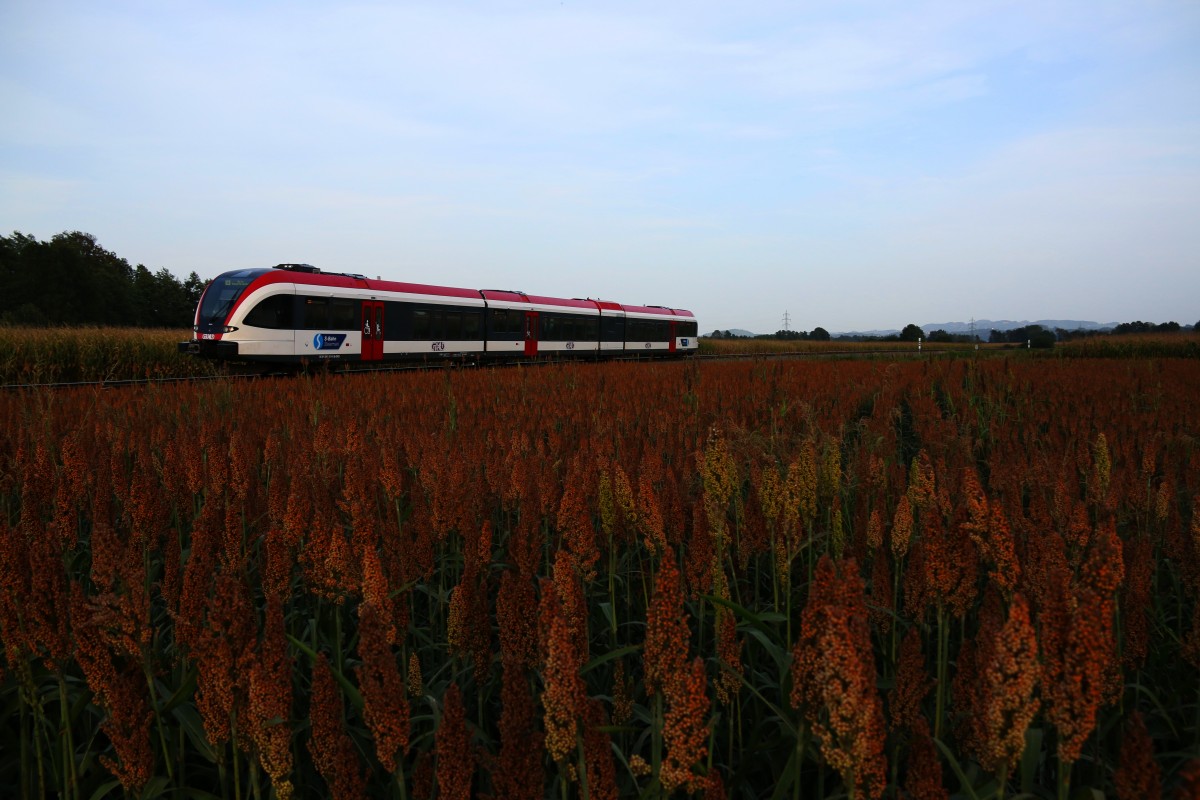 Der "Goldene" Herbst ist auch auf den Feldern zu erkennen . Hirse ist ein recht neues Getreide in unserer Gegend . Hier gleitet ein GTW 2/8 an dem Feld bei Sankt Peter im Sulmtal vorbei. 17.09.2015 Karl Heinz Ferk