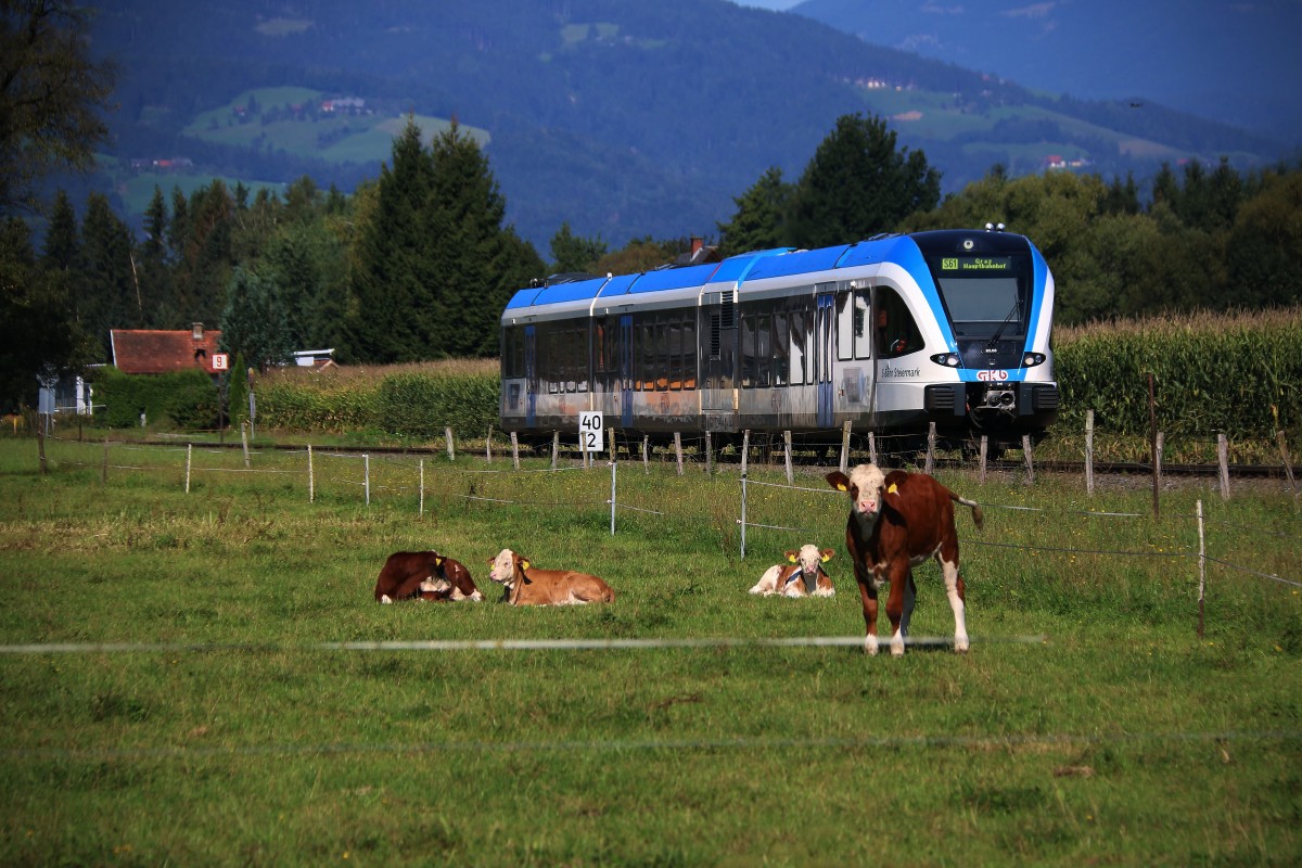 Mehr beeindruckt von dem komischen Typen mit der Kamera vor dem Kopf als von dem vorbeigleitenden GTW 08 scheint dieses Kalb zu sein. Nächst Sankt Peter im Sulmtal am 30.08.2015 Karl Heinz Ferk
