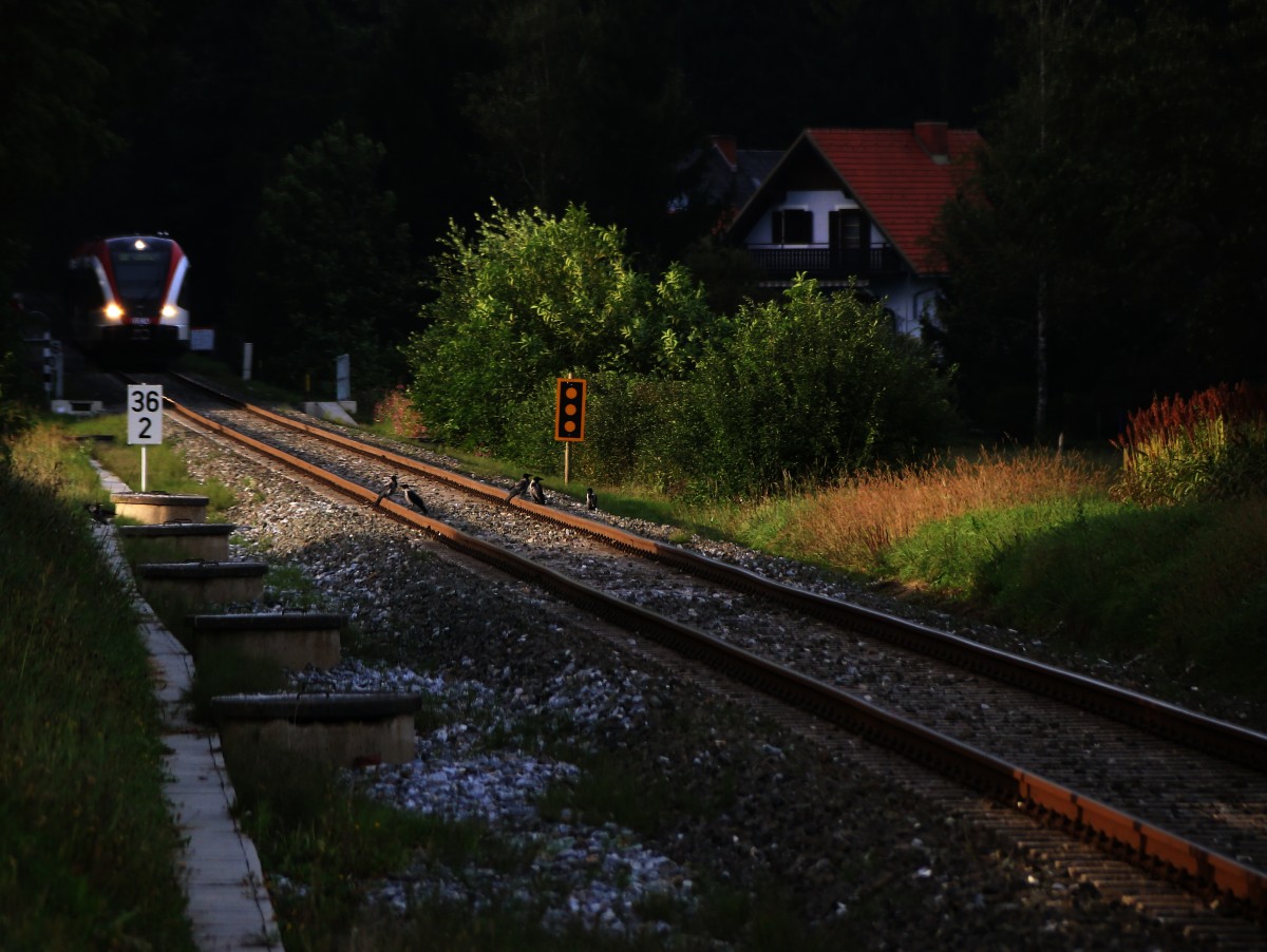 Ohne Sicherheitsschuhe, Warnweste und noch dazu am Schienenkopf halten sich die Krähen im Gleisbereich vor dem herannahenden R8565 am Nachmittag des heutigen 17.09.2015 bei Hohlbach auf. Karl Heinz Ferk