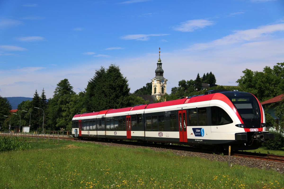 Wohl etwas Besonderes ist nicht nur durch die abgetrennte Lage des Glockenturmes und das Melodien-spielende Geläut die Kirche des kleinen Ortes Sankt Peter im Sulmtal . Hier im Bild zu sehen VT63.06 als Zug der Linie S6 gen Graz Hauptbahnhof am 19.Mai 2015 kurz vor Schwanberg wo er in kürze die Stahlbrücke über einen der Beiden Sulm-zweige befährt. Karl Heinz Ferk