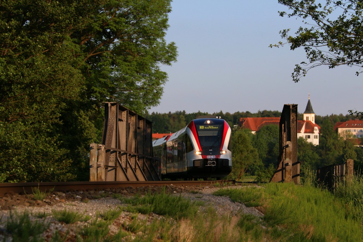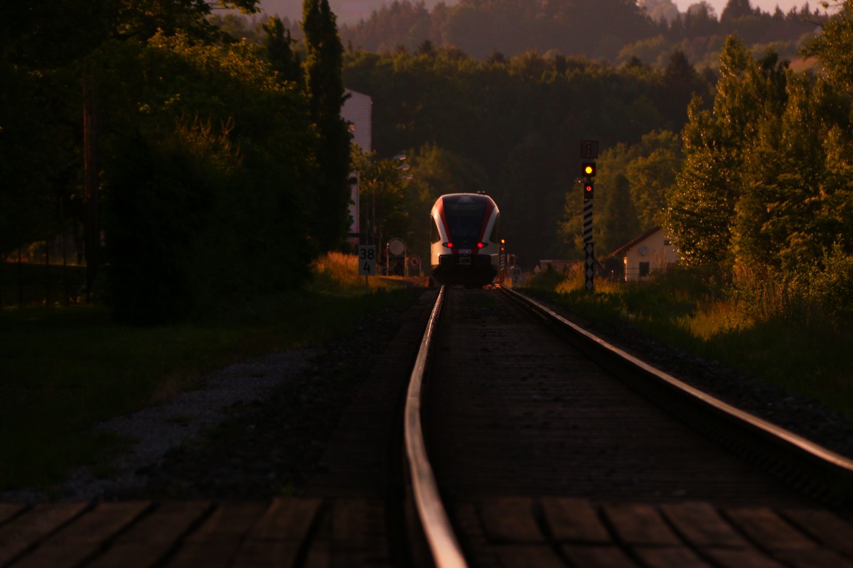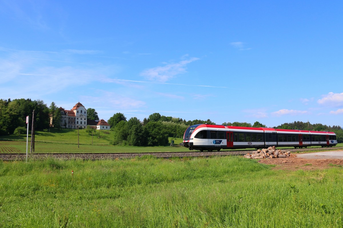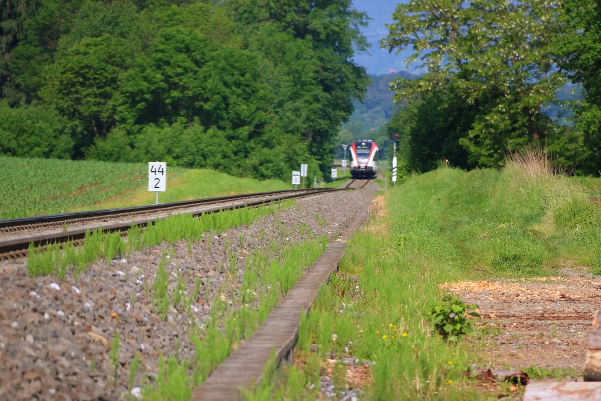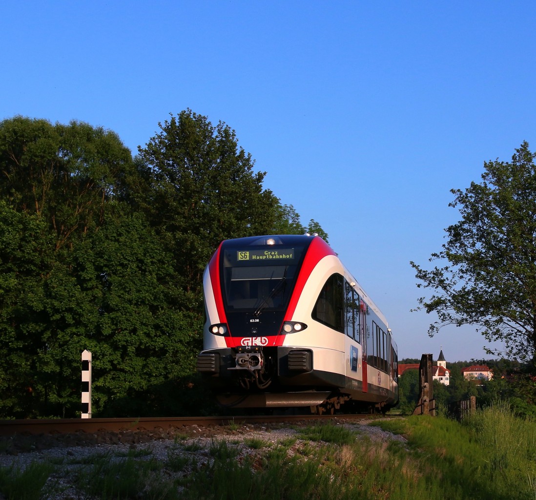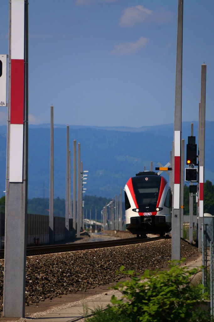 140 Stunden Kilometer Schnell saust der GTW 2/8 an mir vorbei am heutigen 8.05.2015. Im Hinterkopf natürlich das Schreckliche Zugunglück bei Übelbach vom Mittwoch bei dem der erst 21 jährige Triebfahrzeugführer ums Leben kam. Hier in der nähe von Wettmanstätten zu sehen. Karl Heinz Ferk