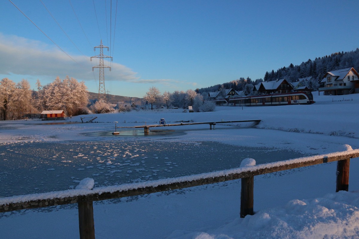 Mal was normales ,... Am Morgen des 18.März 2015 rollt ein GTW 2/8 in den Bahnhof Sankt Martin im Sulmtal Bergla Dahinter 2 Wohnhäuser die Seinerzeit Bergläute der Grube Bergla beheimateten . Karl Heinz Ferk