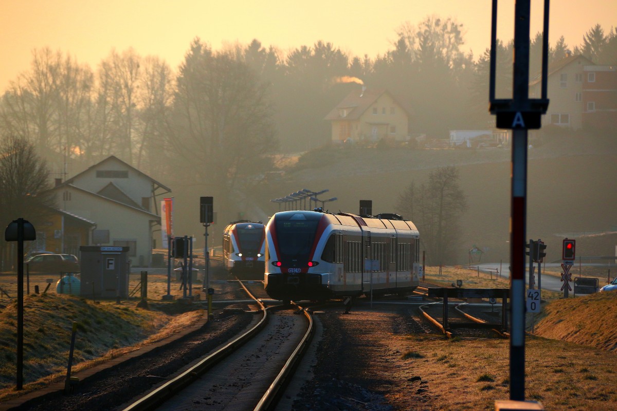 Seit einigen Jahren gibt es im Bahnhof Sankt Martin im Sulmtal Bergla planmäßig Zugbegegnungen der Linie S6. So wie auch hier am Morgen des18.03.2015 Karl Heinz Ferk