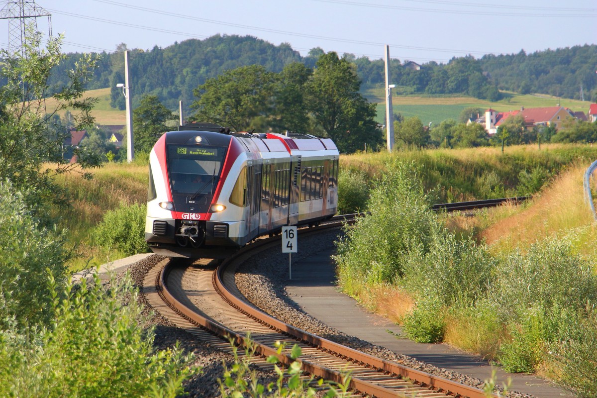 Die Kulisse der kleinen Marktgemeinde Wies ist durch die einstige Wallfahrtskirche "zum gegeiselten Heiland" unverkennbar. Das in den Jahren 1774 bis 1782von Gräfin MariaAnna von Herberstein im Barokstil erbaute Glaubenshaus wacht über den vorbeirauschenden GTW2/8 der Graz Köflacher Eisenbahn deren Strecken Abschnitt von Lieboch nach Wies Eibiswald auch den Namen "Wieserbahn" von dem Ort bekommen hat. Hier zu sehen 5063.10 als R8558 am Morgen des 28.Juni 2014 der seine Fahrgäste über der Linie S61 nach Graz bringen wird. Karl Heinz Ferk