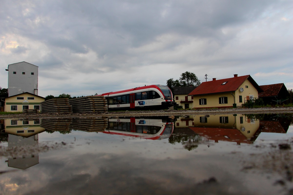 Ein "Spiegel-Zug-Suchbild" Die nette Kapelle nächst St.Martin im Sulmtal Bergla macht sich auch im Spiegel recht gut . der sich dahinter vorbeischwindelnde GTW2/8 der Graz Köflacher Eisenbahn hat nix davon. 2.Juni 2014 Karl Heinz Ferk