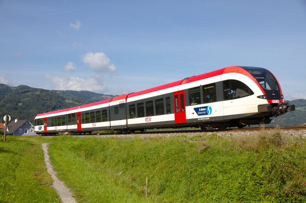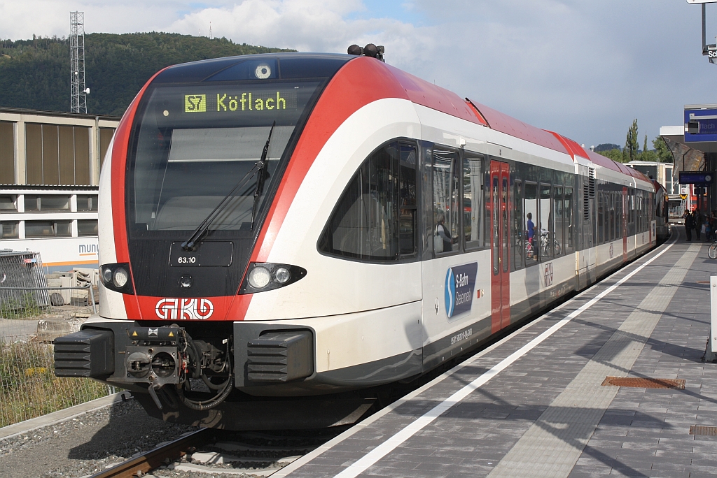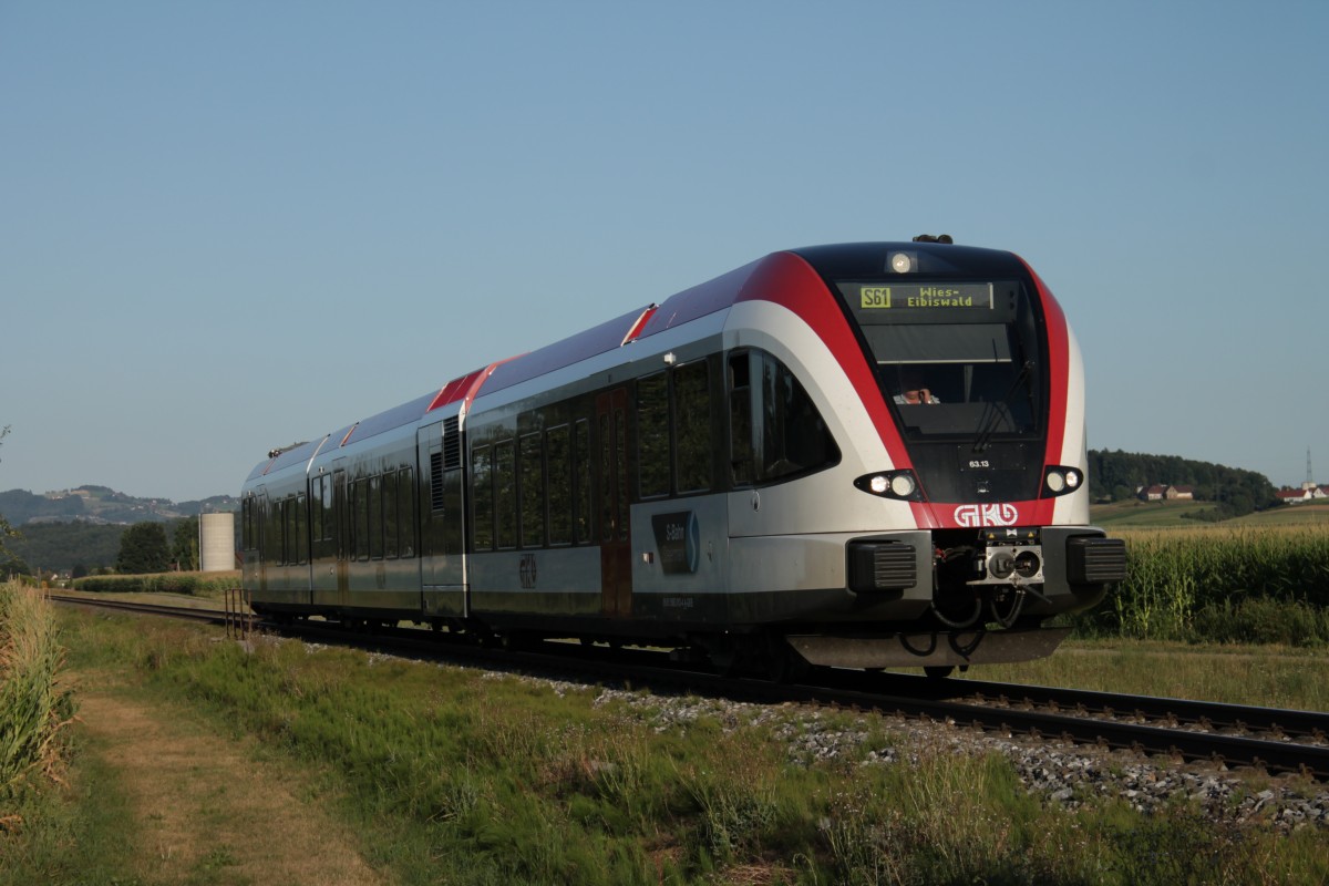 Auch die GKB hat einen ihrer Stadler-GTw (5063.008) mit den Farben der S-Bahn Steiermark ausgestattet. Hier bei Frauental-Bad Gams auf der S 6 (Graz - Wies-Eibisfeld) zusammen mit Nr. 010, der die üblichen GKB_Farben trägt. Hermann-Josef Weirich