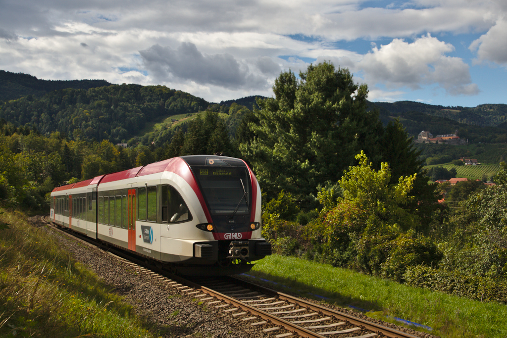 Ein moderner GTW auf der Fahrt in Richtung Wies-Eibiswald; im Hintergrund rechts ist die Burg von Deutschlandsberg zu sehen. (13.09.2013) Markus Pöschl