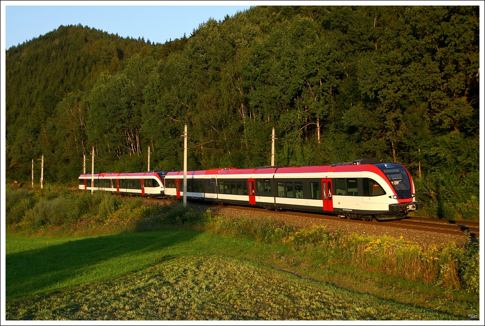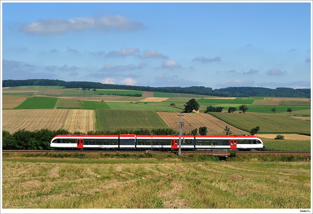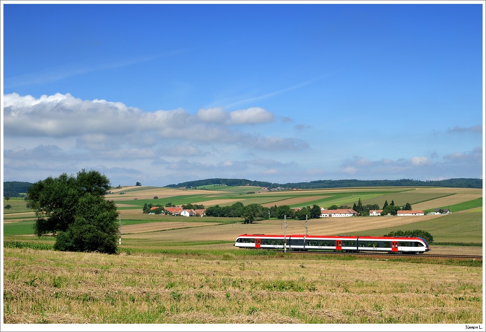 GTW im fernen Land. Weit ab seiner zukünftigen Heimat begibt sich GKB GTW 5063.001 auf seine erste Probefahrt. SLP 95758 auf der Westbahn von Wien nach Amstetten; Ollersbach, 14.8.2010. Jürgen L.