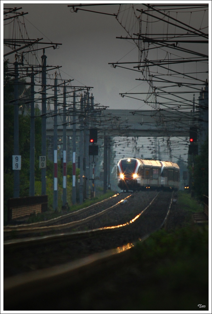 Die ersten beiden neuen GTWs der Graz-Köflacher-Bahn, GKB-GTW 5063.003 und 5063.002, wurden am Samstag, den 21.08.2010, von Breclav pred über Wien (-Gramatneusiedl-Pottendorf-) und den Semmering nach Graz, zum Graz-Köflacher-Bahnhof überstellt. Ca. 2 1/2 Stunden hinter dem Plan, kamen die nagelneuen Triebwagen dann gegen 20.20h am Ziel an. In den nächsten 3-4 Wochen werden die nächsten folgen. Ab dem Fahrplanwechsel 2010/11 sollen diese STADLER-Gelenkstriebwagen für die GKB auf der derzeit bis Wettmannstätten schon eingleisigen Koralmbahn sowie auch auf ihrer Heimatlinie, Richtung Köflach oder Wies-Eibiswald, unterwegs sein. In den letzten kräftigen Sonnenminuten, fahren die beiden als SLp 19927 durch den Bahnhof Marein-St. Lorenzen. Thomas M.