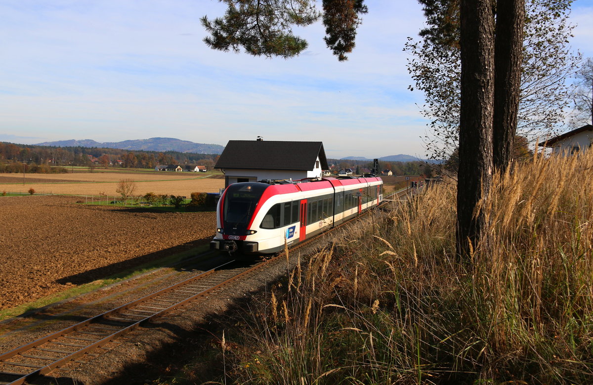 Der blaue VT 63.08 war am 30. September 2016 nach Wies-Eibiswald unterwegs und wurde von mir zwischen Groß St-Florian und Frauental-Bad Gams fotografiert.