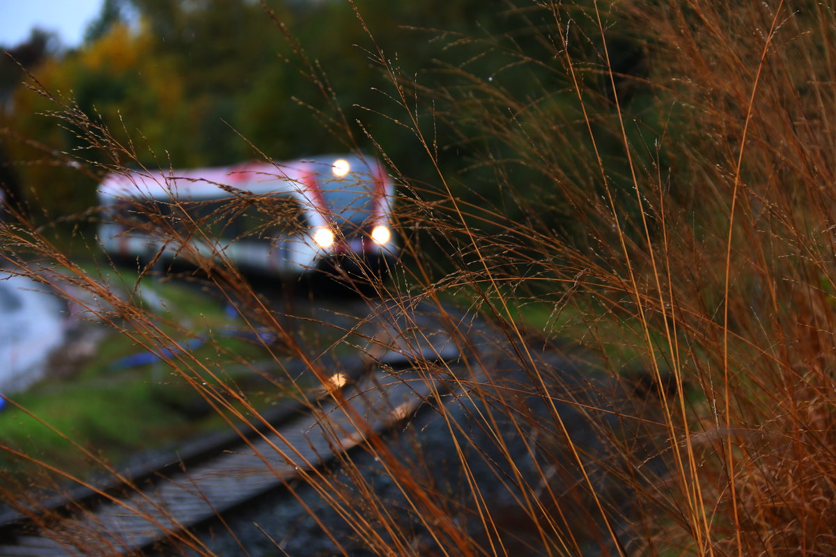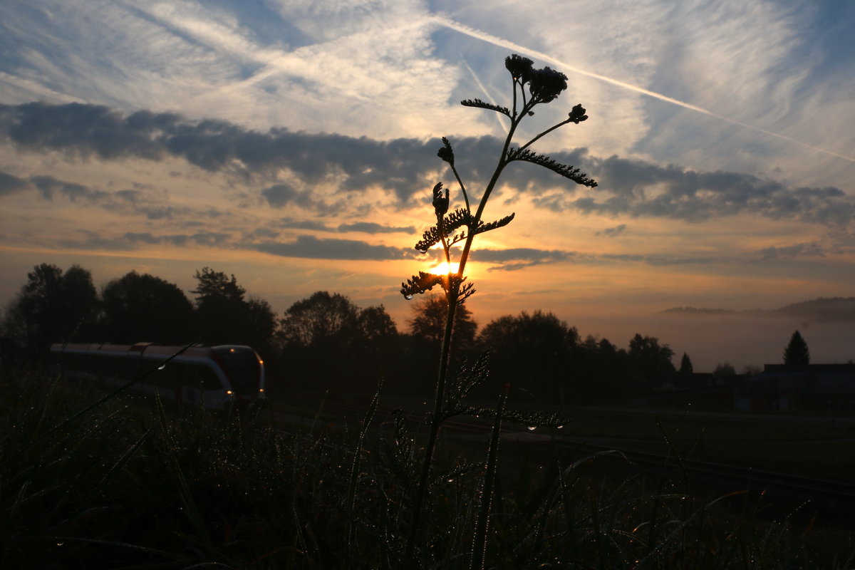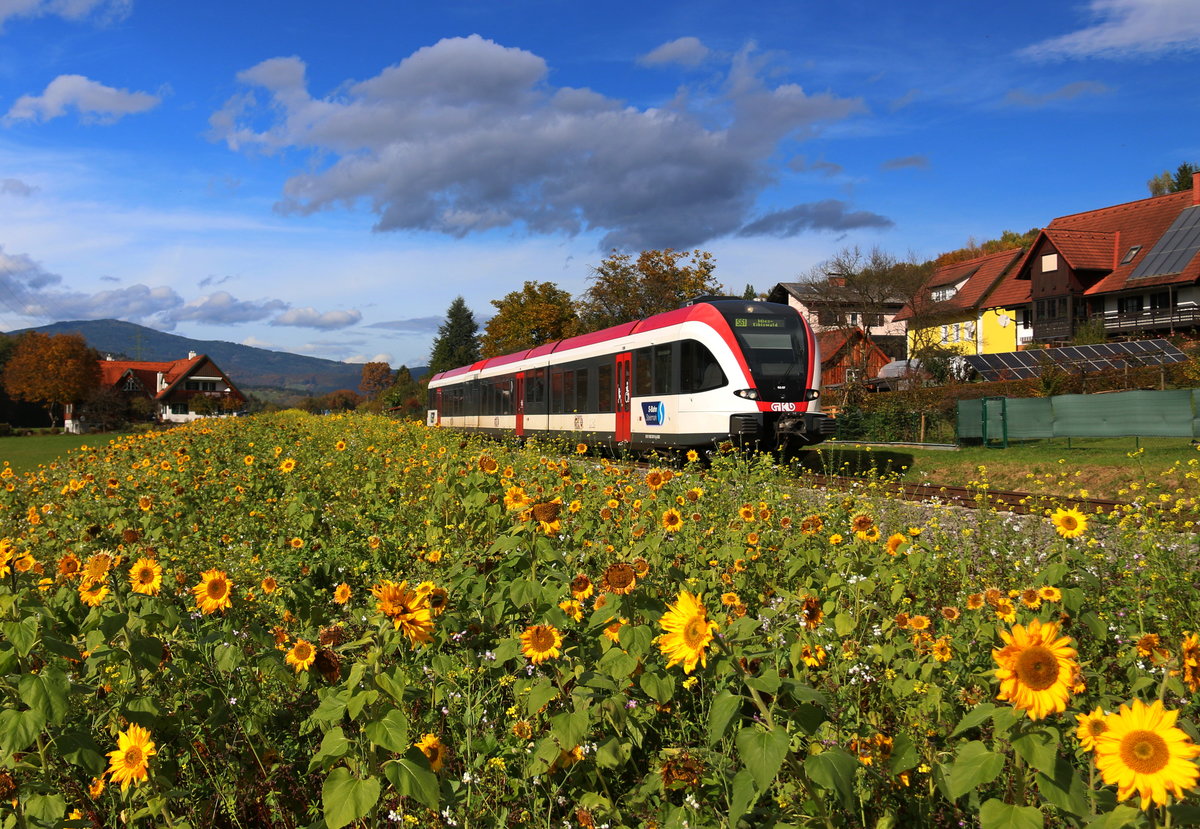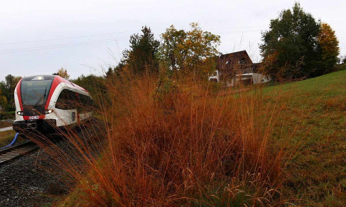 Am Mittag des heutigen 21.Oktober 2016 rollt ein GTW 2/8 hinter der "GRAS-Fasade" vorbei. Karl Heinz Ferk