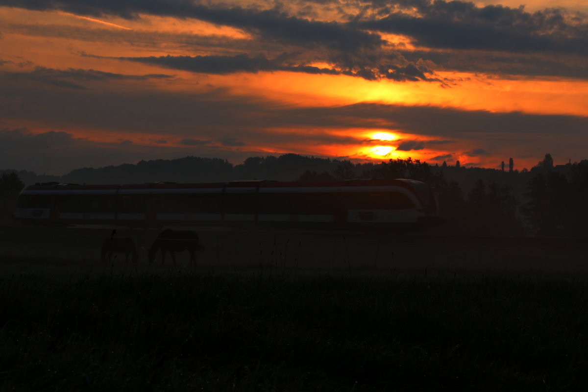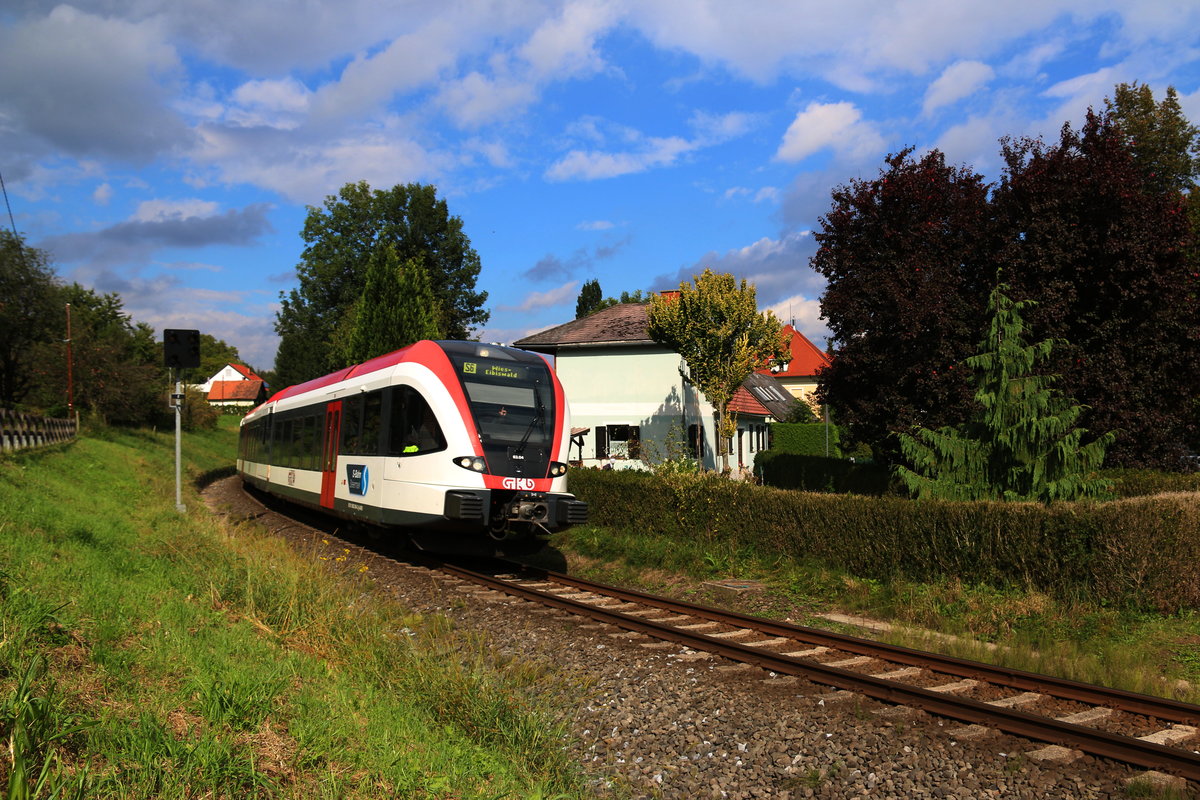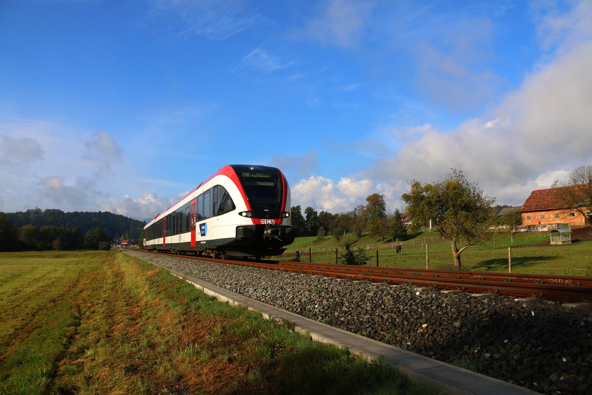 Es ist zwar Quasi vor der Haustüre , trotzdem habe ich bis dato nicht viel Zeit gefunden mich dem Köflacher Ast der GKB zu widmen. Am vergangenen Samstag konnte ich einige Bilder machen . Hier kurz vor der Haltestelle Gaisfeld geht's für den GTW gen Graz . 10.09.2016 Karl Heinz Ferk