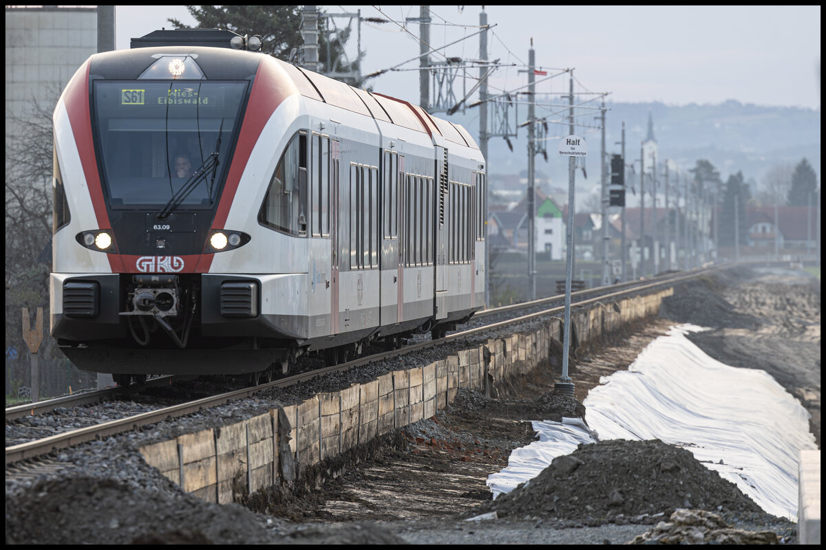 22. März 2024 . Bei Frauental Bad Gams erreicht der morgendliche R8551 bald sein Ziel . Hier laufen die nächsten Schritte für den 2 Gleisigen Ausbau zur Koralmbahn . Karl Heinz Ferk