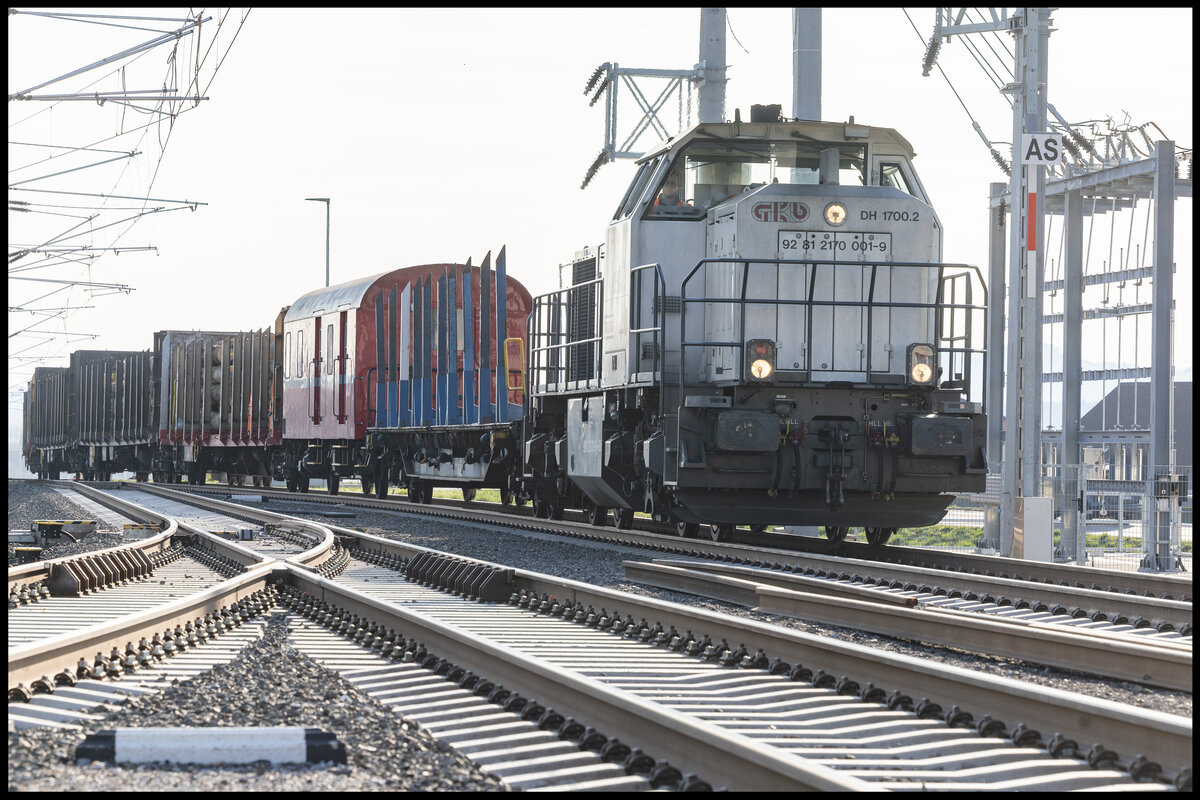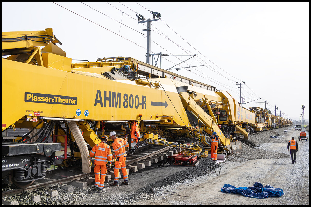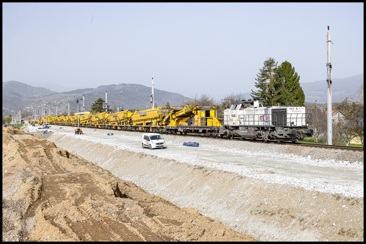 30. März 2024 bei Frauental Bad Gams . Eine AHM800 arbeitet sich durch den Unterbau der GKB Gleise . Am Östlichen Ende steht DH 1700.2 bereit den Abraum abzutransportieren. Karl Heinz Ferk