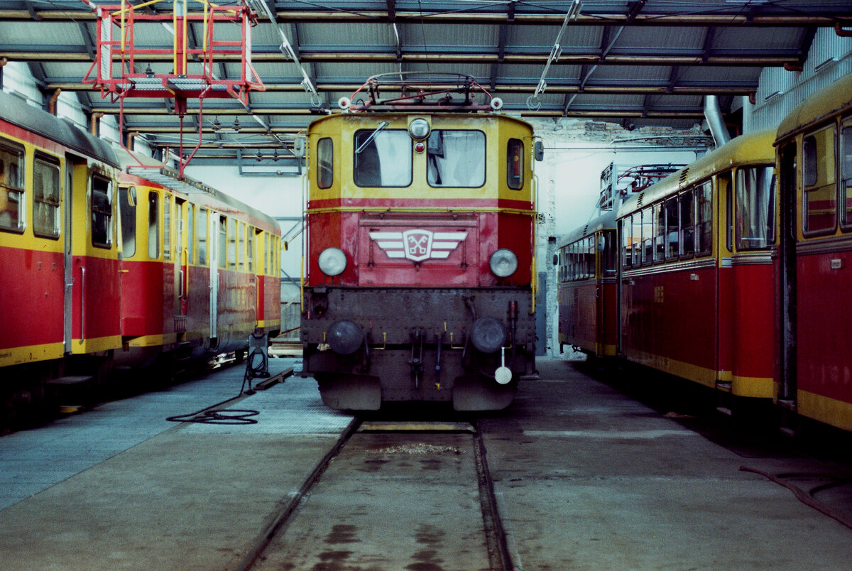 Das Depot Schruns der privaten Montafonerbahn war ein Sammelsurium verschiedenster Wagentypen und Lokomotiven. In der Mitte eine Ellok der ÖBB-Baureihe 1045 (1045.01 ?), rechts daneben drei Uerdinger Schienenbusse (Uerdinger X 10.903 und zwei reguläre Uerdinger VT/VS 10). Neben der 1045 (MBS) steht ET 10.101 MBS (von der Bad Eilsener Kleinbahn erworben).
