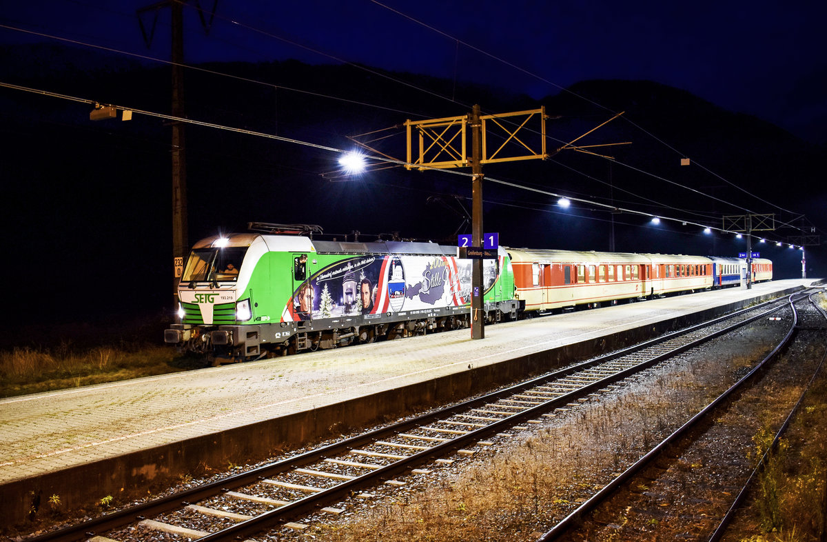 ELL 193 219-3 "Stille Nacht", der SETG, hält mit dem SR 17521 (Graz Hbf - Lienz), im Bahnhof Greifenburg-Weißensee.