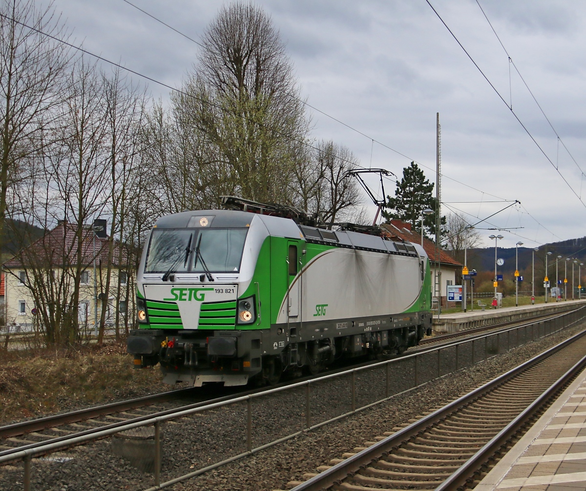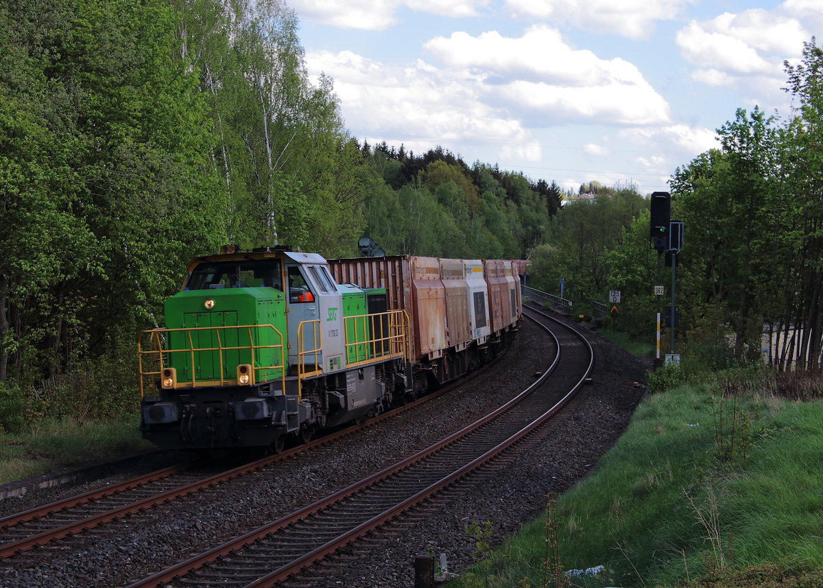 Neben dem sehr regen Personenverkehr um den oberfränkischen Bahnknoten Hof herum, gibt es natürlich auch Güterverkehr. Dieser könnte sich mit dem Ausbau des KV Terminals in Hof noch verstärken. SETG V1700.03 (277 004) bringt leere Rungenwagen nach Hof, hier beim ehemaligen Rangierbahnhof Oberkotzau. 19.05.2018 Ivonne Pitzius
