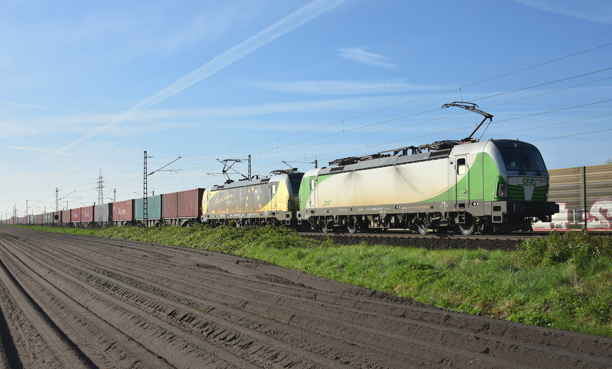SETG mit der 193 821-6 und 193 218-5 "15 Jahre SETG / Beethoven" in Doppeltraktion mit Container unterwegs nach Hamburg. Höhe Bardowick, 27.04.2018. Stefan Bree