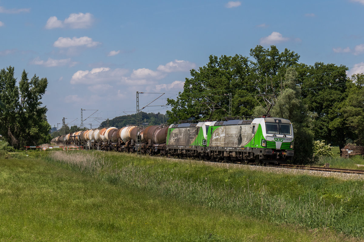 193 831-5 "Christian Doppler" der SETG überquert mit dem zweiten Teil des mit geschlämmter Kreide beladenden Kesselwagenzugs die neue Angerschluchtbrücke.