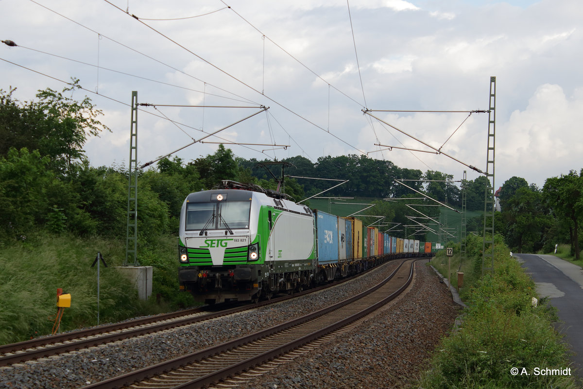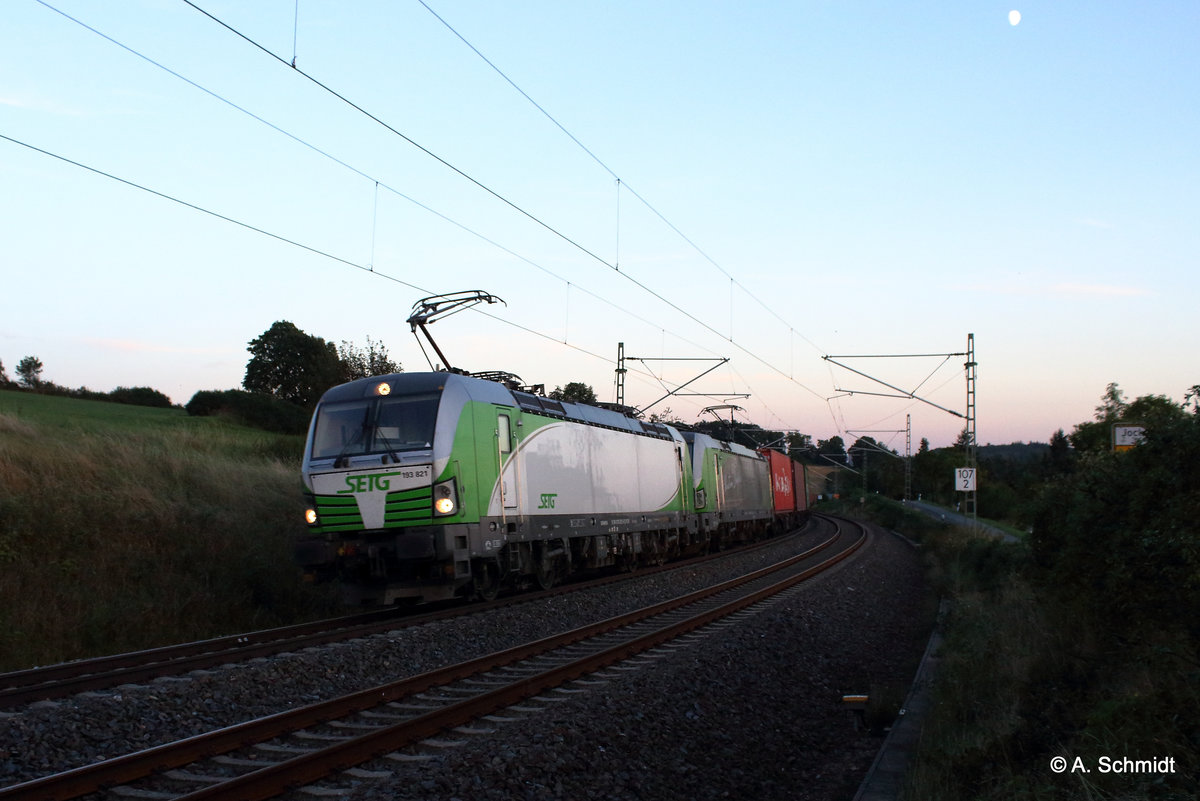Leider schon nach dem Sonnenuntergang aber der Mond ist schon zusehen beim SETG Vectron Doppel im Vogtland bei Jocketa am 13.08.2016. Es fuhr die 193 821 und der "Christian Doppler" 193 831-5 einen Containerzug von Hof nach Hamburg. Andreas Schreiber