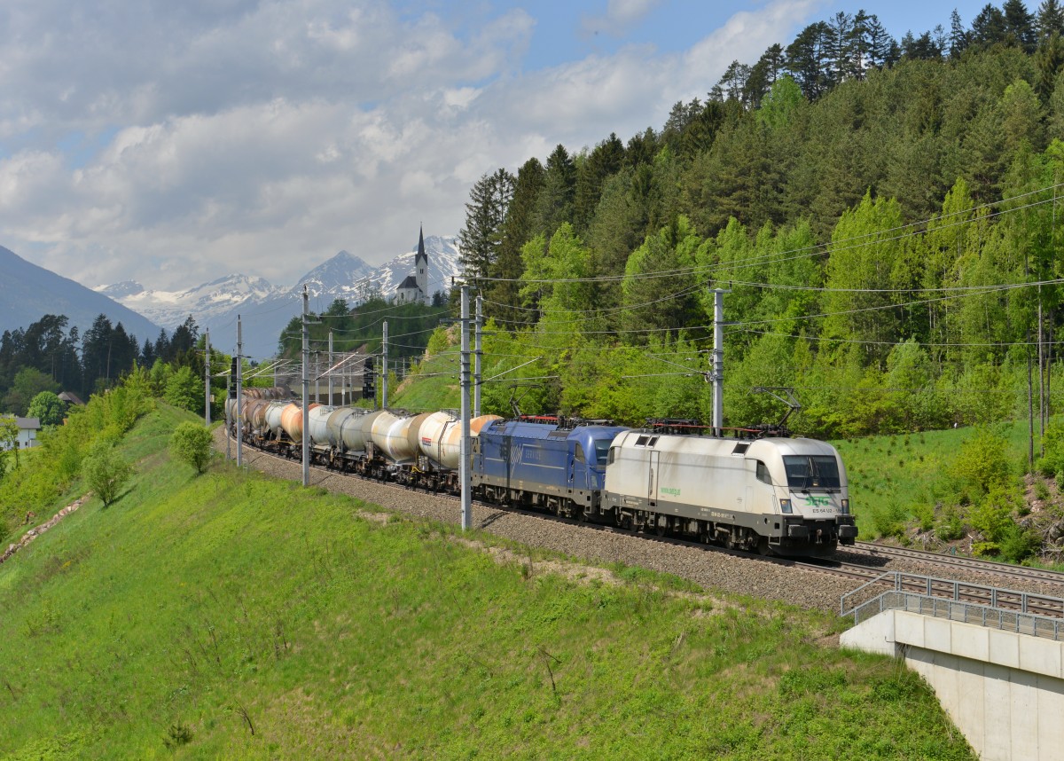 Zwei 193 der SETG fahren am 10.5.2015 mit einem Güterzug in Richtung Mallnitz-Obervellach. Hier zu sehen bei der Durchfahrt durch den Bahnhof Penk. Hans-Peter Kurz
