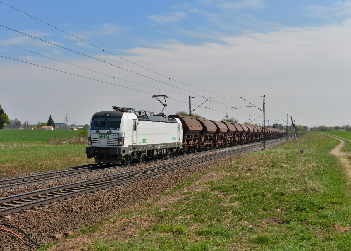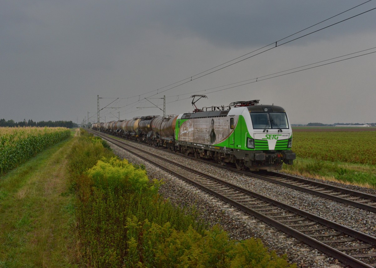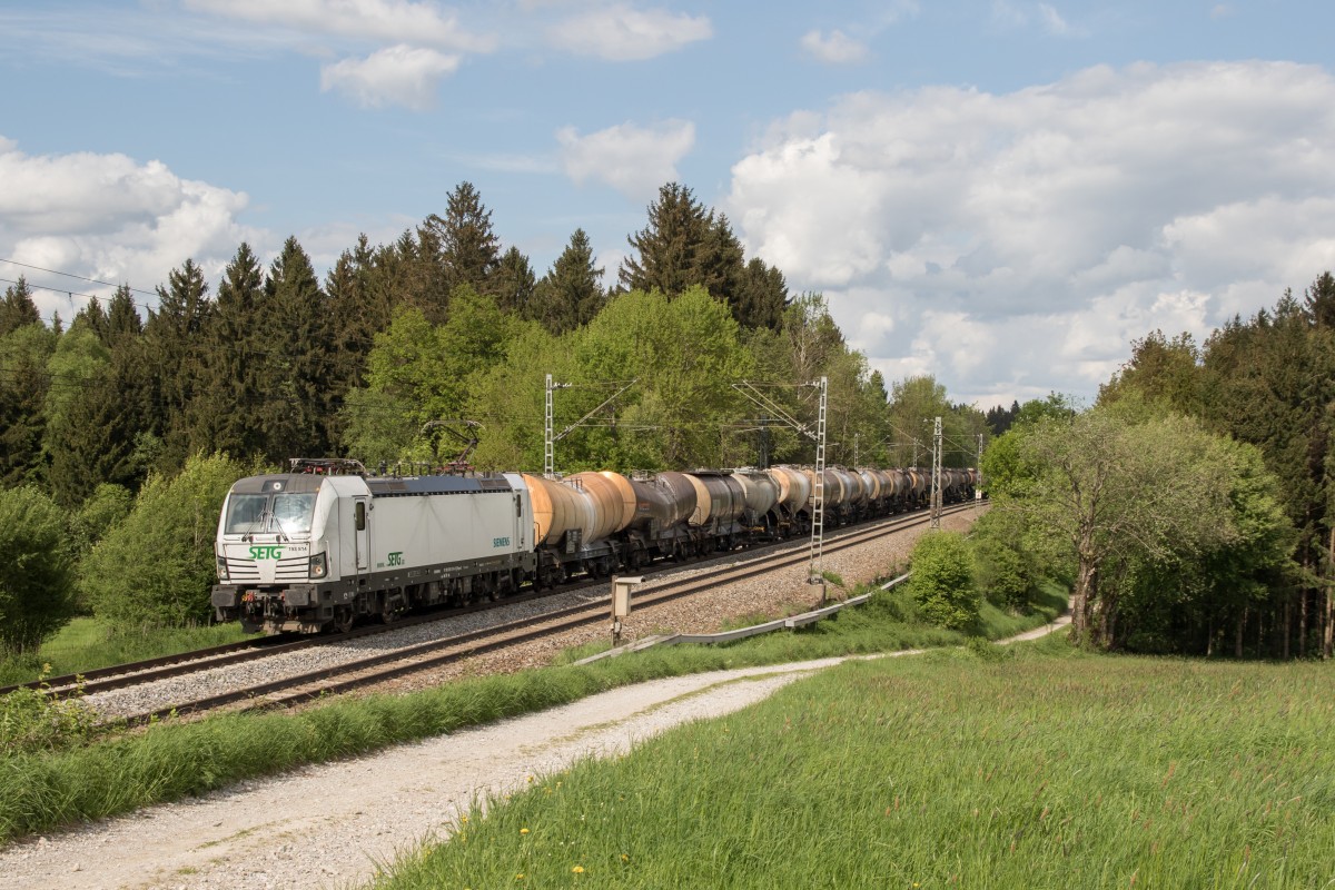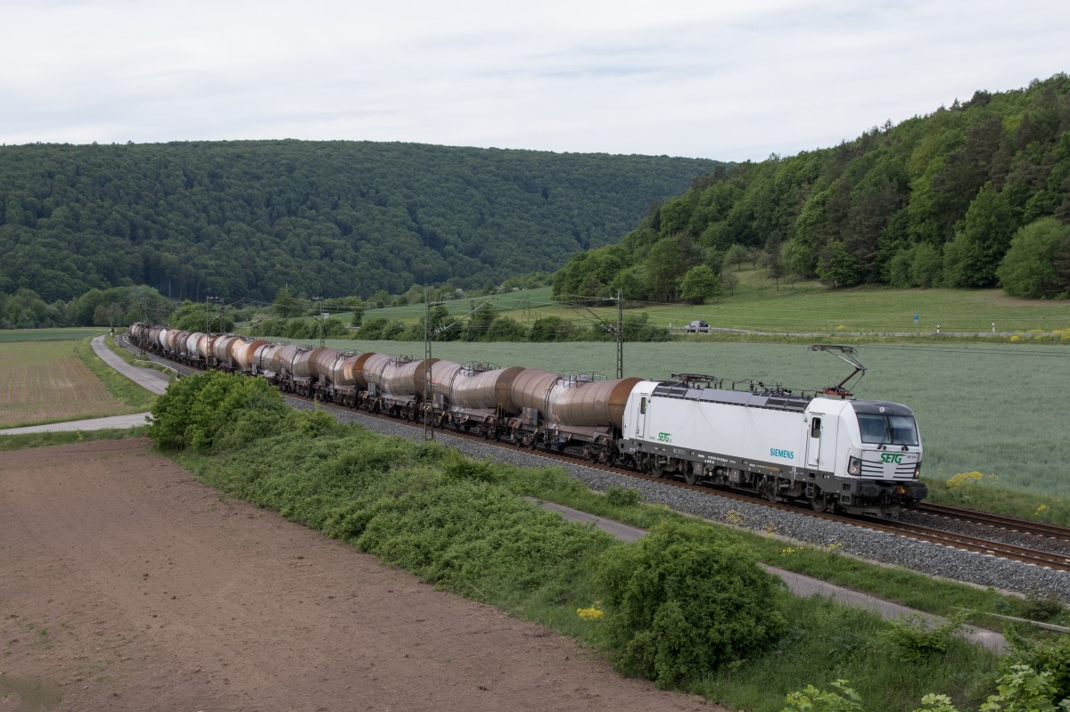 193 814 des österreichischen Unternehmens SETG fährt am 14.5.15 mit einem Kesselzug durch das Maintal in Richtung Würzburg.
