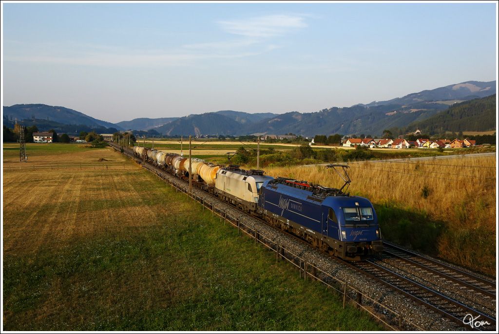 Raindrops keep falling on my head - Im strömenden Regen, ziehen SETG ES 64 U2 101 und MGW 183 500 den Tauernumleitungszug SLGAG 47889 durch das Aichfeld.