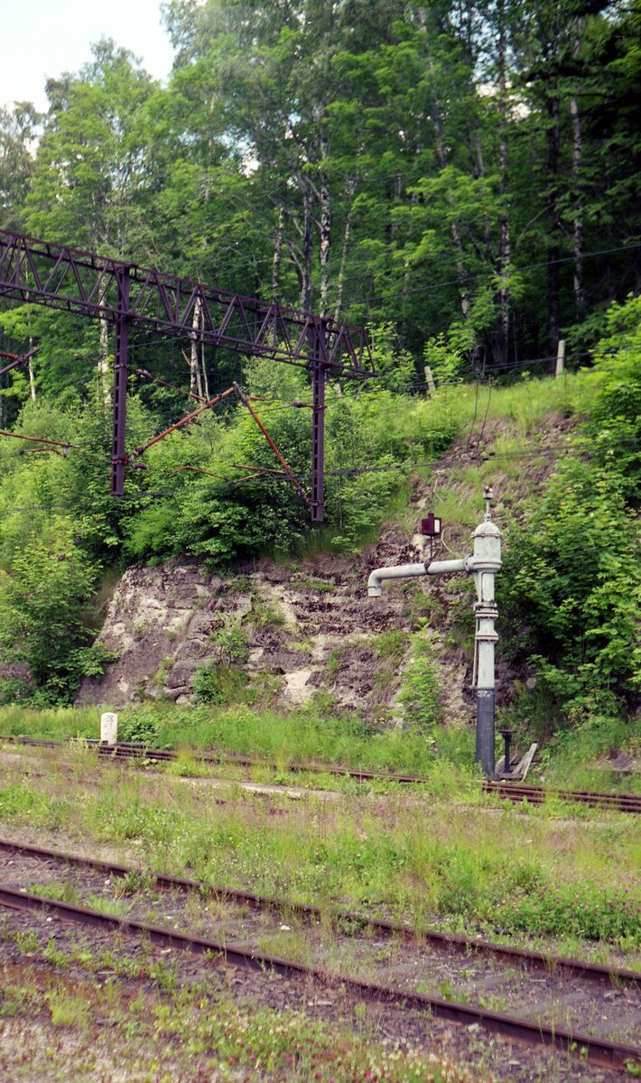 Zacken-Bahn Hirschberg–Schreiberhau (Jelenia Góra-Szklarska Poręba)__Bf. Ober-Schreiberhau (Szklarska Poręba Górna). Auch wenn seit 1987 wieder elektrisch bis hier gefahren wird, für gelegentliche Dampfzug-Fahrten ist der Wasserkran imer noch sehr nützlich...29-06-1992 Klaus-Erich Lisk