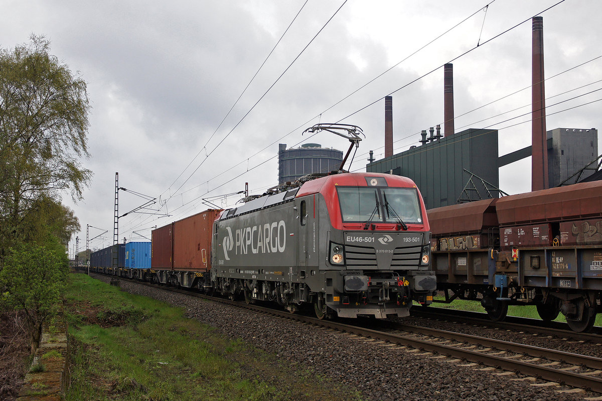 PKP Cargo EU46-507, 193-507 (91 51 5370 019-9 PL-PKPC) mit leerem Autotransportzug in Richtung Osnabrück (Marl, NI, 26.04.2025).
