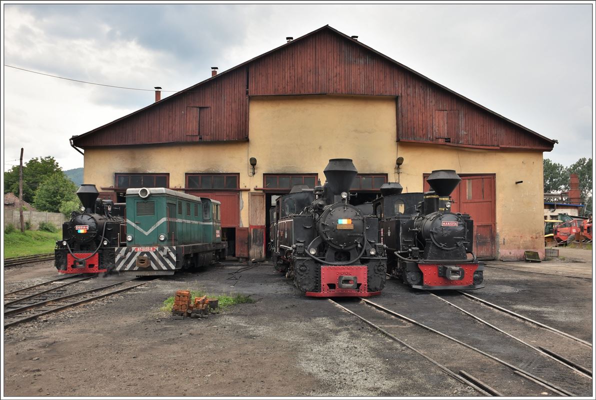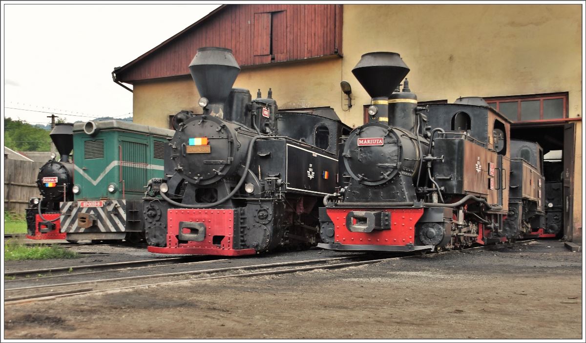 87-0015-5, 764.408 "Cozia 1",87-0033-8, 764.435 "Bavaria" und 764.211 "Mariuta" vor dem Lokschuppen in Viseu de Sus. (13.06.2017)
