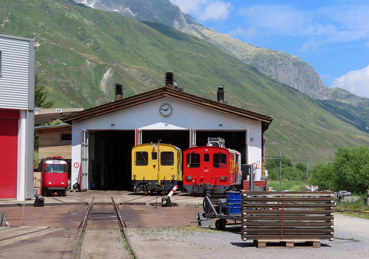 Im Hintergrund wartet die Lok BFD 9 (ex Brig-Furka-Disentis-Bahn) auf die Weiterfahrt Richtung Gletsch - Oberwald. Die Draisine 506 hat beim Gegenzug im Scheiteltunnel zwischen Muttbach-Belvédère und Furka Schiebedienst geleistet. Der Scheiteltunnel ist 1.8 km lang und die Steigung beträgt in der erwähnten Fahrtrichtung während den ersten 1500 m 30 Promille. Es ist keine Zahnstange vorhanden. So kann übermässige Dampfentwicklung verhindert werden und im Notfall wäre eine Hilfslok bereits am Zugschluss. Das Foto wurde vom Publikumsbereich aus gemacht. Furka, 28.7.2022 Markus Gmür