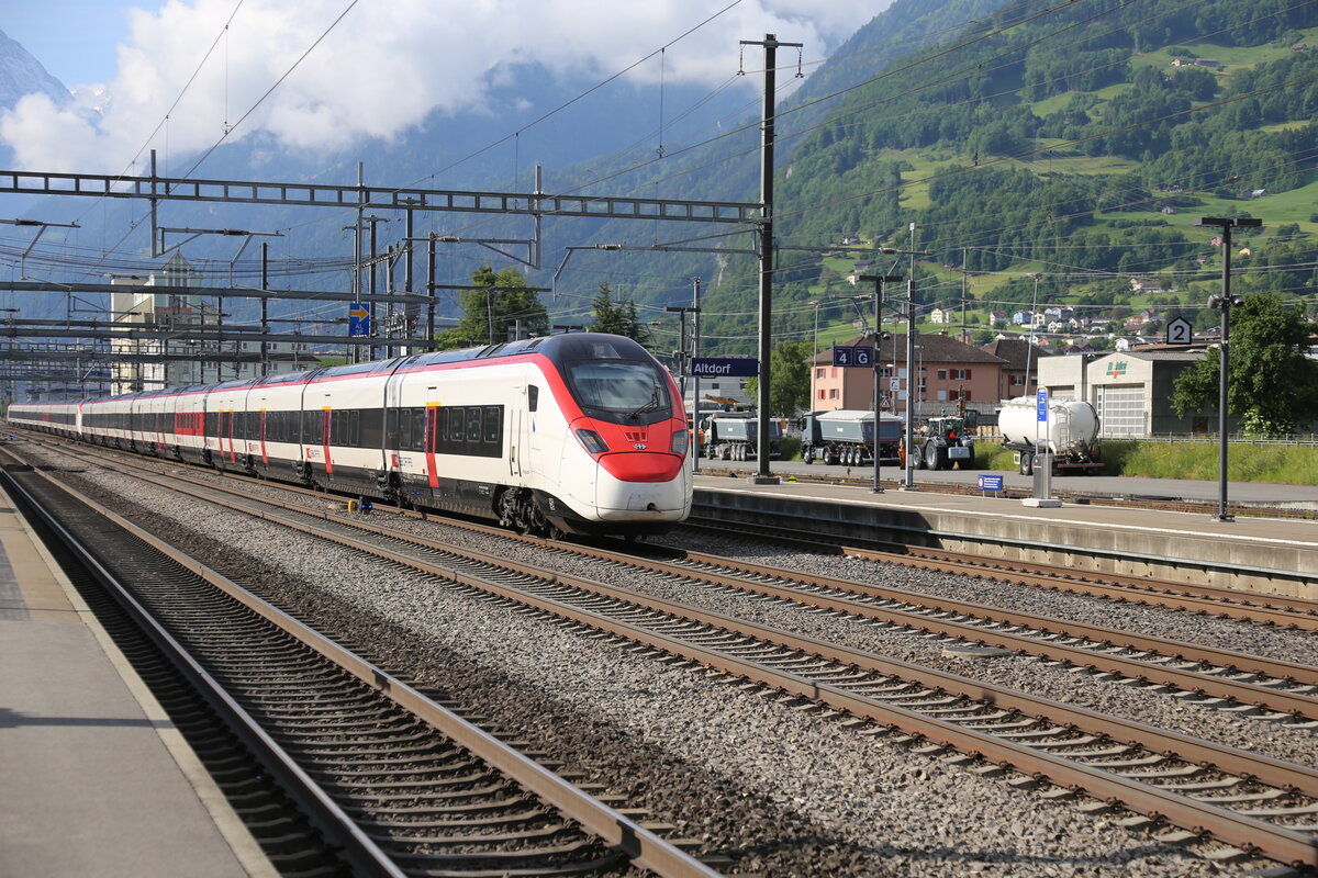 Eine Doppel Einheit ETR ist hier am 24.5.2025 aus Locarno kommend auf dem Weg nach Zürich und fährt hier um 8.56 Uhr durch den Bahnhof Altdorf. Gerd Hahn