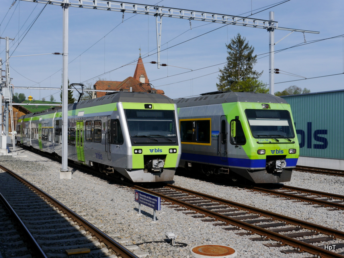 BLS - Neue und alte Farbgebung Zweier NINA RABe 525 011 und RABe 525 014 abgestellt im Bahnhof von Huttwil am 22.04.2018