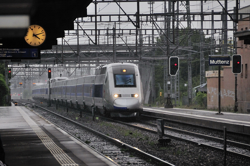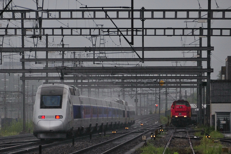 Farblich angepasst an die Umgebung: TGV-Doppel in der Ausfahrt von Muttenz Richtung Zürich. Faszinierend wie die Gischt den Zug umspielt... (10.08.09). Helmut Dimitroff