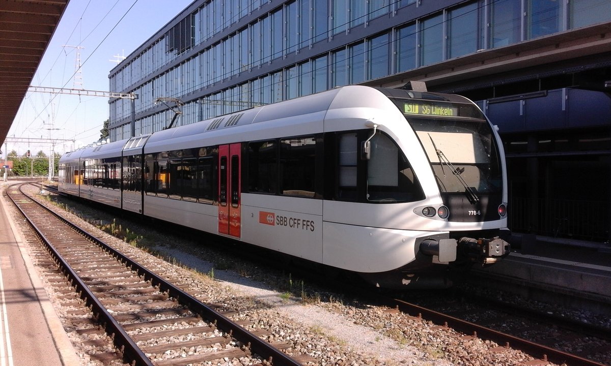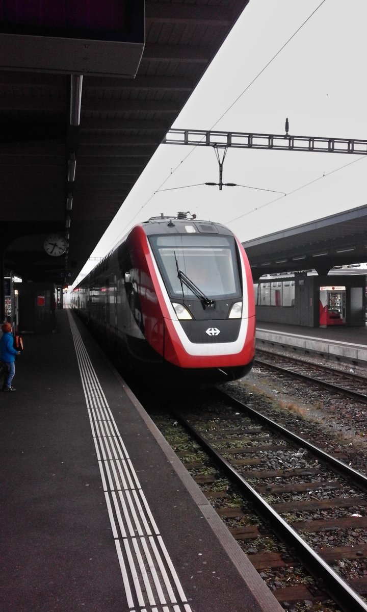 Zum Beispiel 54,45m Triebzug vom Stadler am Stück! Der GTW 526 778 ist ein Viergliederzug dieser Gattung und stand als S11 nach St. Gallen Winkeln auf Gleis 6 bereit.