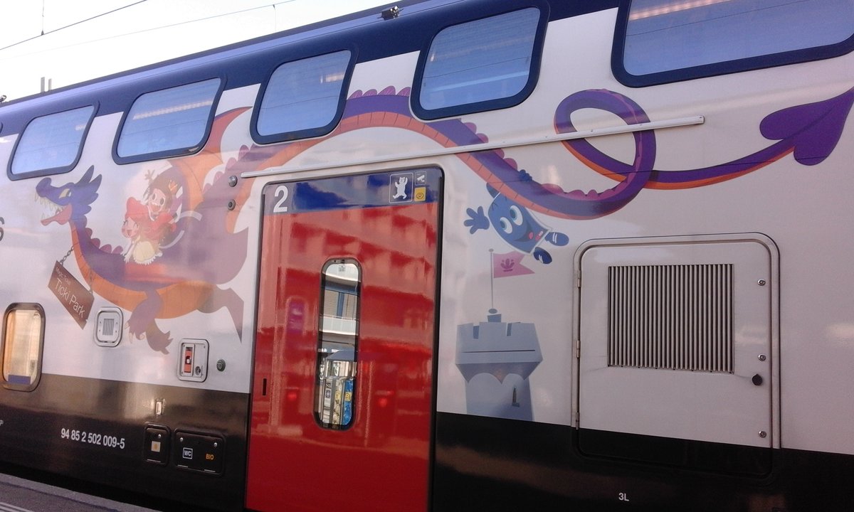 Die imposante Folierung, die auf die Familienzone im Zug hinweist, ist ein echter Blickfang. Abgelichtet beim Twindexx RABDe 502 009 "St. Gallen".