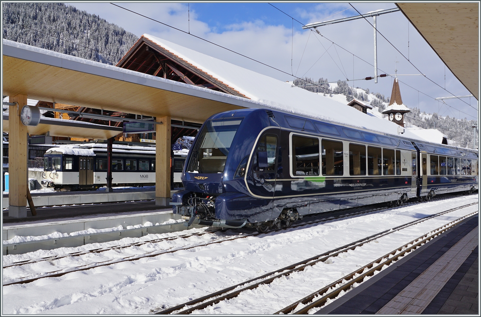 Für die Beförderung der GoldenPass Panoramic Züge lackierte/beklebte die MOB die beiden Ge 4/4 8002 und 8004 in diesem passende Farbgebung. Das Bild entstand in Zweisimmen und zeigt eine der beiden Lok vor dem GoldenPass Classic nach Montreux. Im Hintergrund ist noch ein nicht umgebauter Be 4/4/Bt Triebzug zu erkennen.